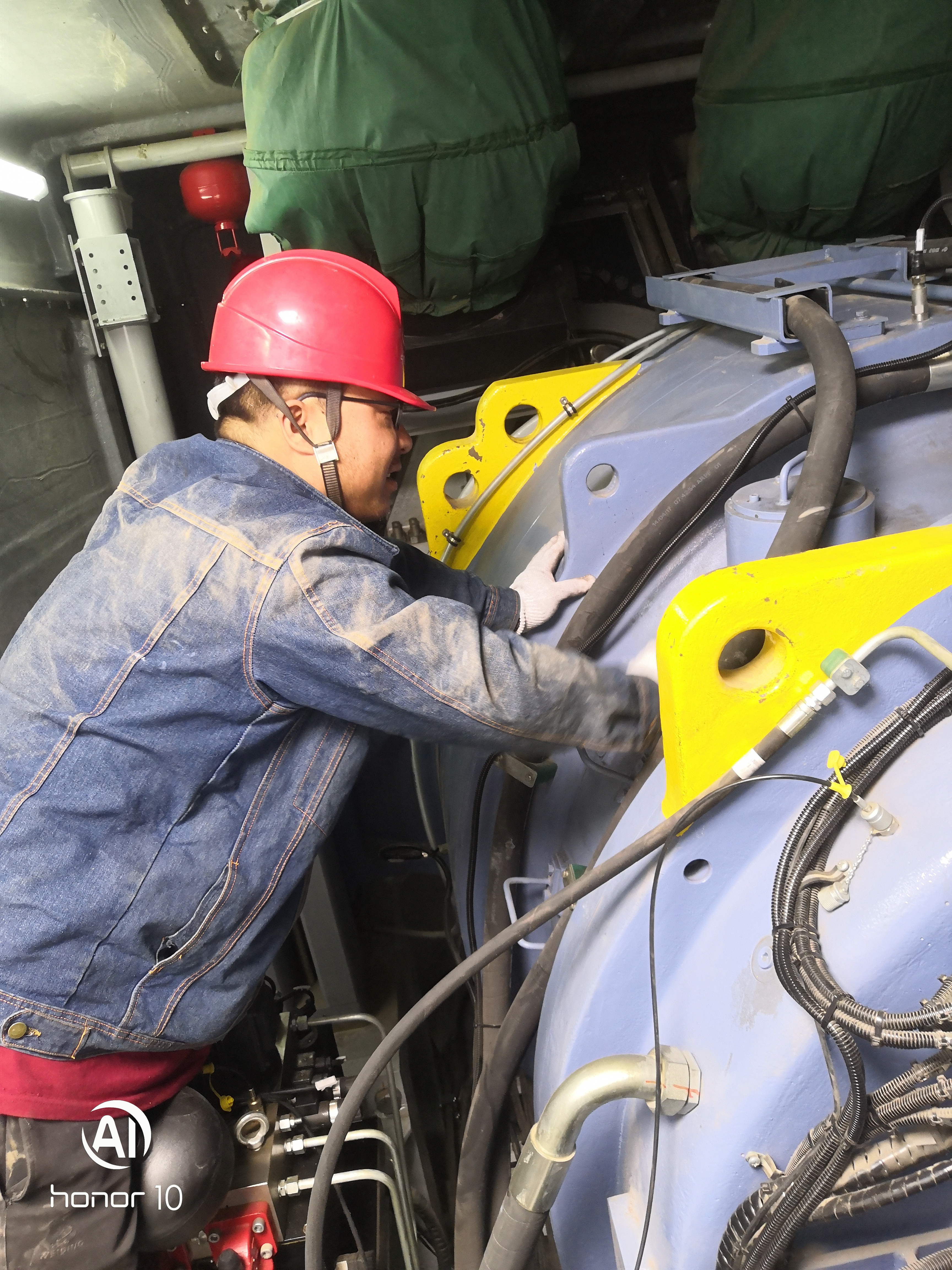 做好安全措施后,根據(jù)風機顯示“變槳通訊故障”判斷,我們將故障點鎖定在了輪轂控制系統(tǒng)上。進入輪轂內(nèi)部,首先要對主軸鎖定。我們?nèi)齻€人分工,由兩人配合打開高速剎車盤防護罩,對主軸進行手動盤車,另外一個人守在機械鎖定銷處,等待位置契合后將鎖定銷插入。此時機艙內(nèi)異常悶熱,在接近5m/s的風速下,手動盤車也極耗力氣,不一會兒,汗水就像斷線的珠子一樣滴落下來。鎖定主軸后還來不及歇息,我們又貓著腰、爬行著穿過狹窄的通道進入輪轂內(nèi)部,經(jīng)更換EL6751模塊后,通訊恢復,我們隨即欣喜地解除了所有安全措施。可在啟機過程中才發(fā)現(xiàn)故障遠沒有這么簡單,我們再次做好安全措施,進入輪轂內(nèi)部,依次對EL6751模塊之前的十個EL1008模塊更換檢查。終于,在換到第七個模塊時,風機順利通過自檢測試成功并網(wǎng)。大家情不自禁地擊掌慶祝,頭上的汗水仍然大顆大顆地滴落著,工作服上被汗水浸染出了一道道白色的波浪線。下塔后,大伙才感覺饑腸轆轆,時間早已是午夜時分。