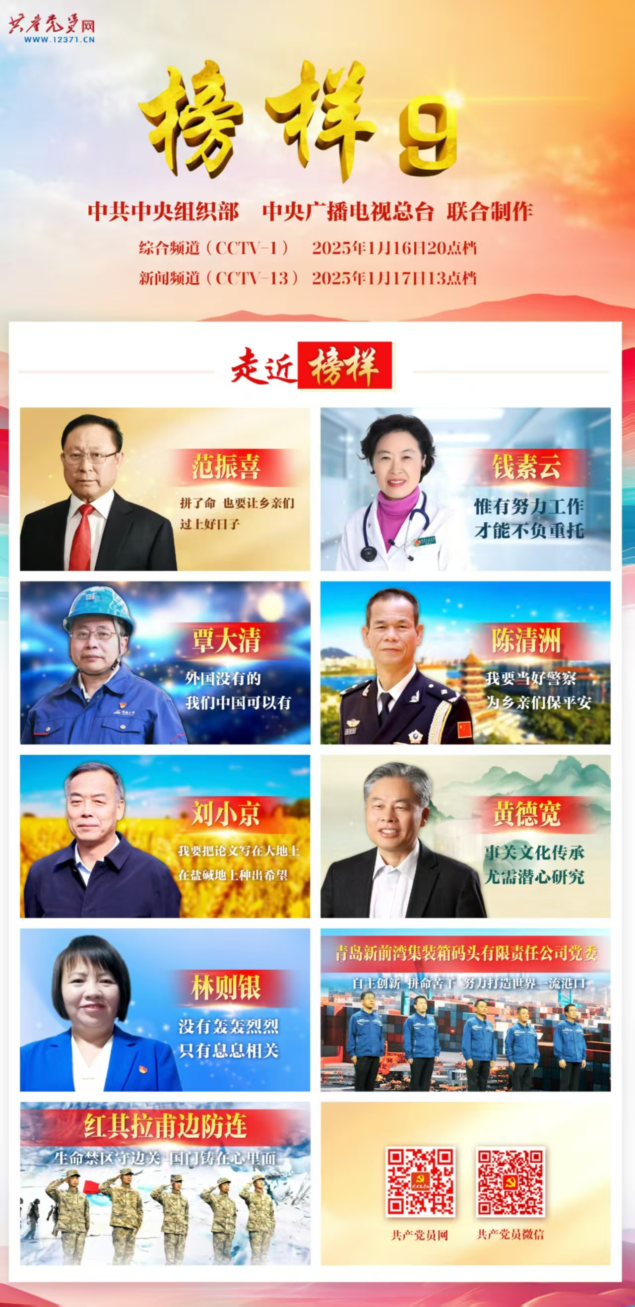 為深入學(xué)習(xí)貫徹習(xí)近平新時代中國特色社會主義思想和黨的二十屆三中全會精神,教育引導(dǎo)基層黨組織和廣大黨員干部學(xué)習(xí)榜樣、爭當(dāng)先進(jìn),積極投身中國式現(xiàn)代化建設(shè),中央組織部、中央廣播電視總臺聯(lián)合制作了《榜樣9》專題節(jié)目。節(jié)目邀請范振喜、錢素云、覃大清、陳清洲、劉小京、黃德寬、林則銀7名黨員和山東青島新前灣集裝箱碼頭公司黨委、陸軍某邊防團(tuán)紅其拉甫邊防連參加錄制,通過典型事跡展示、現(xiàn)場訪談、重溫入黨志愿書等形式,生動展現(xiàn)學(xué)習(xí)踐行習(xí)近平新時代中國特色社會主義思想突出事跡,以及堅(jiān)定信念、踐行宗旨、改革創(chuàng)新、擔(dān)當(dāng)作為的高尚品質(zhì)和精神風(fēng)范,彰顯基層黨組織戰(zhàn)斗堡壘作用和黨員先鋒模范作用。